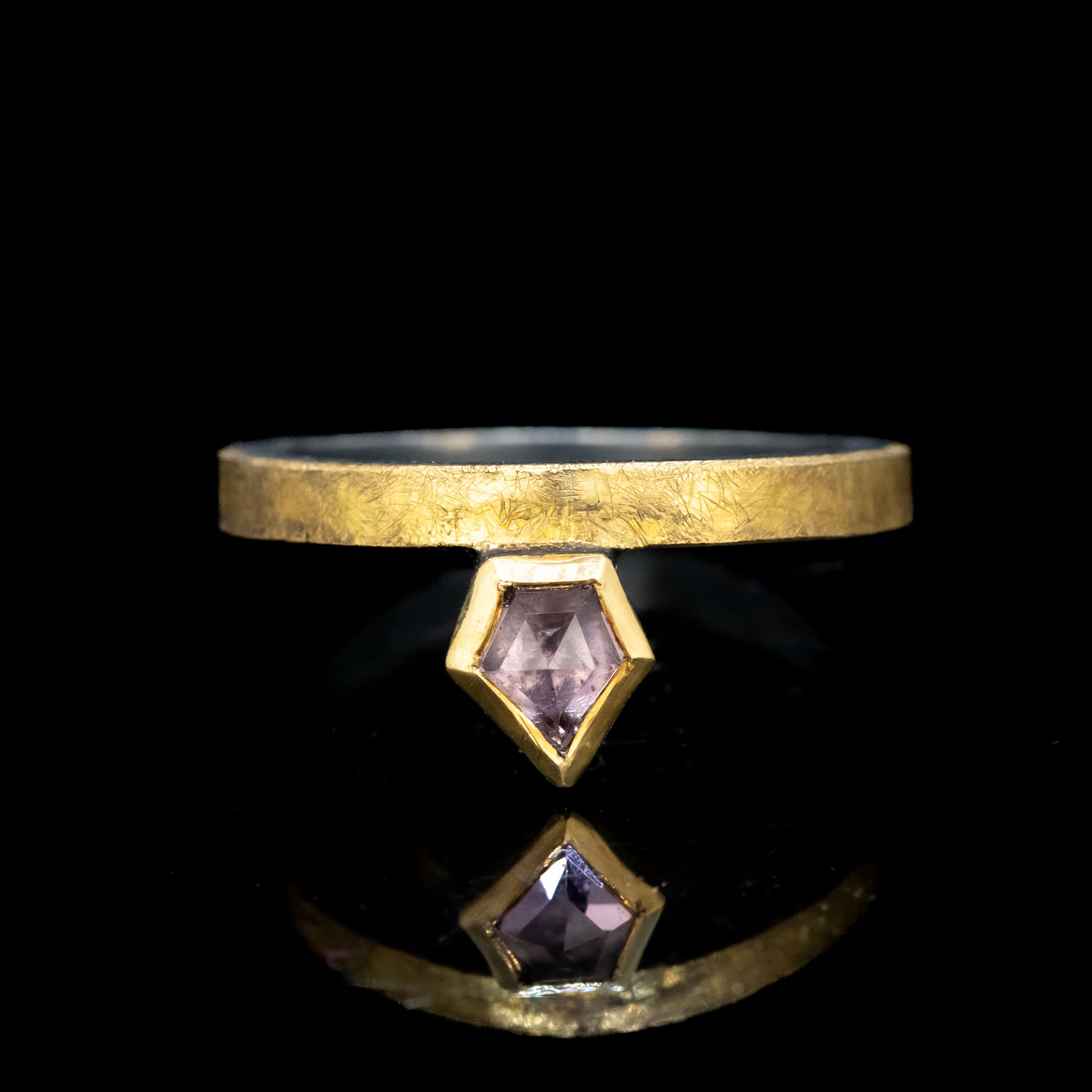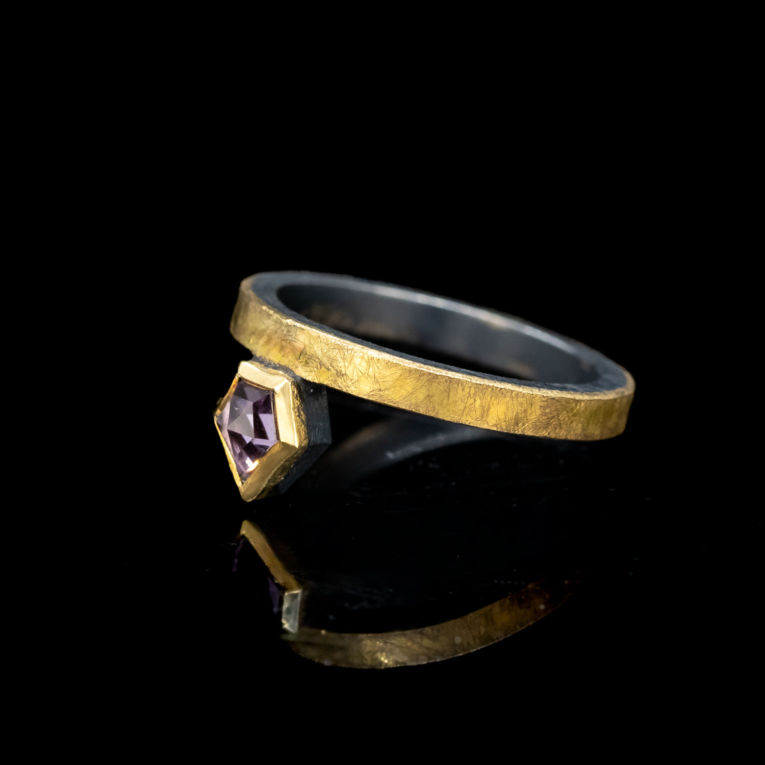 It all starts with the gathering of ingredients. For these rings, we began with 24kt gold, sterling silver, and a collection of beautiful and uniquely cut spinels in some of our favorite colors. The metals are all smelted and forged here in studio to make the hand fabricated ring bands and settings to hold on to the precious gems. A delicate file finish is applied to the 22kt outside bands of the rings while a deep black patina is applied to the sterling silver to give the perfect contrast of glowing gold and depth to these pieces.