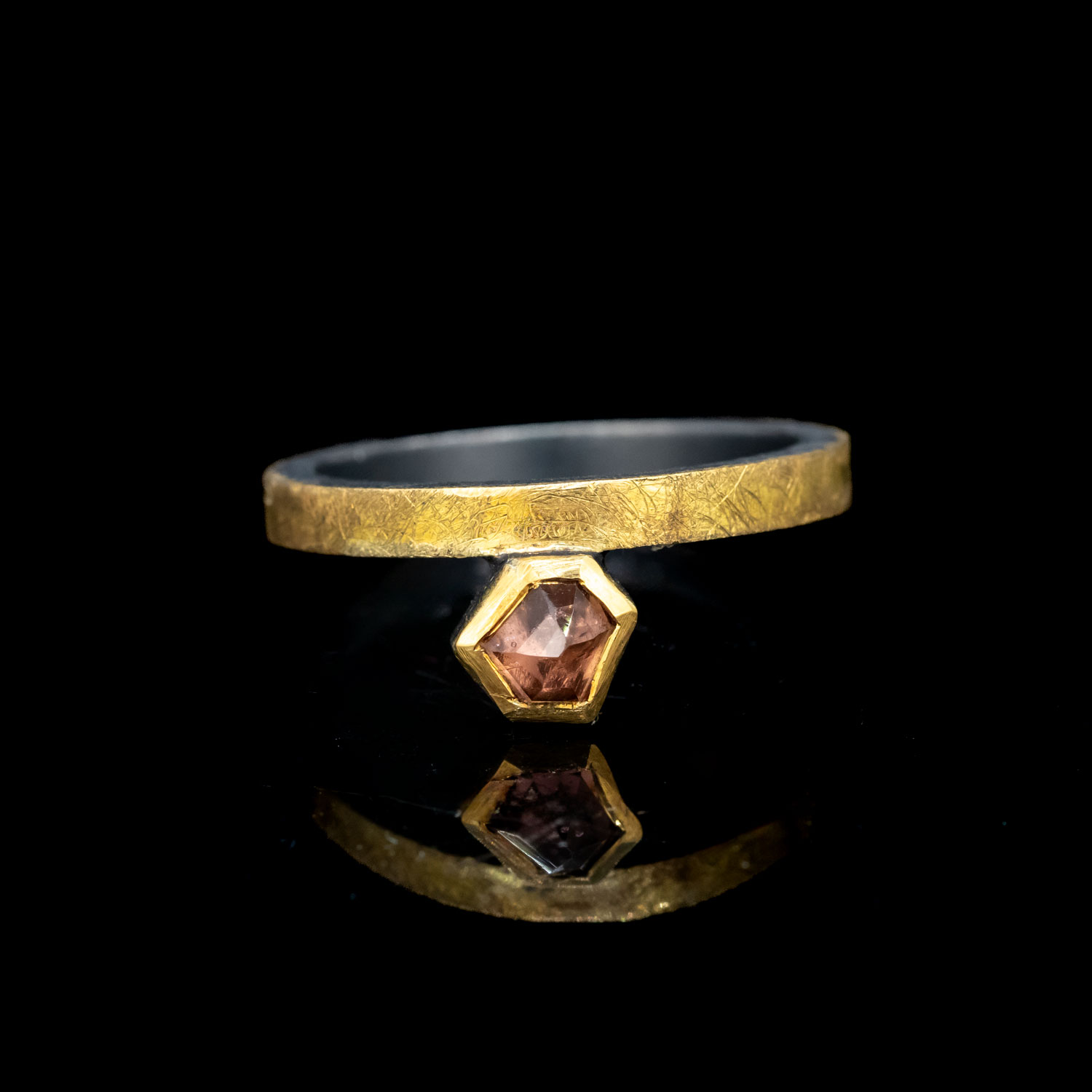 It all starts with the gathering of ingredients. For these rings, we began with 24kt gold, sterling silver, and a collection of beautiful and uniquely cut spinels in some of our favorite colors. The metals are all smelted and forged here in studio to make the hand fabricated ring bands and settings to hold on to the precious gems. A delicate file finish is applied to the 22kt outside bands of the rings while a deep black patina is applied to the sterling silver to give the perfect contrast of glowing gold and depth to these pieces.
