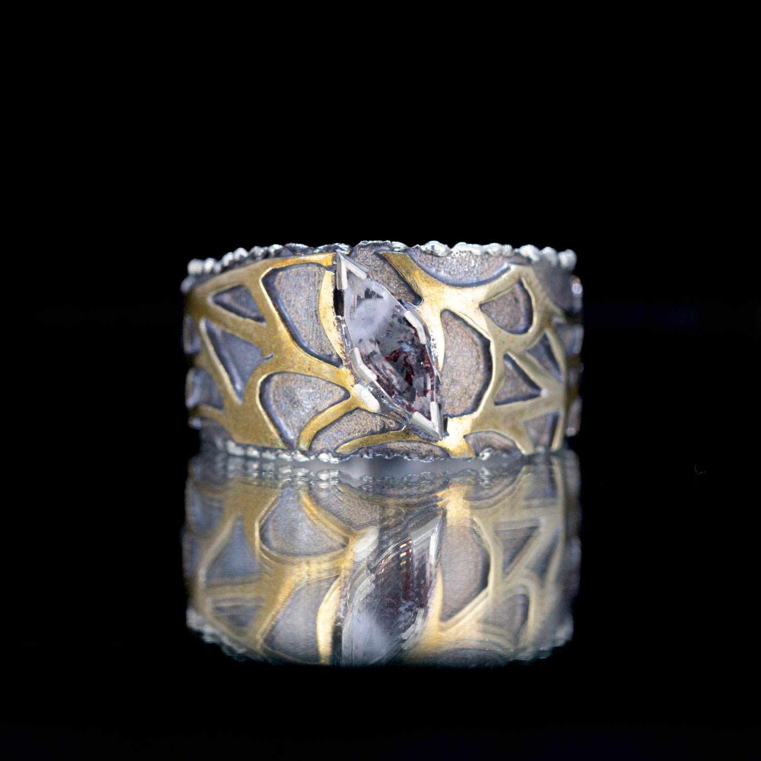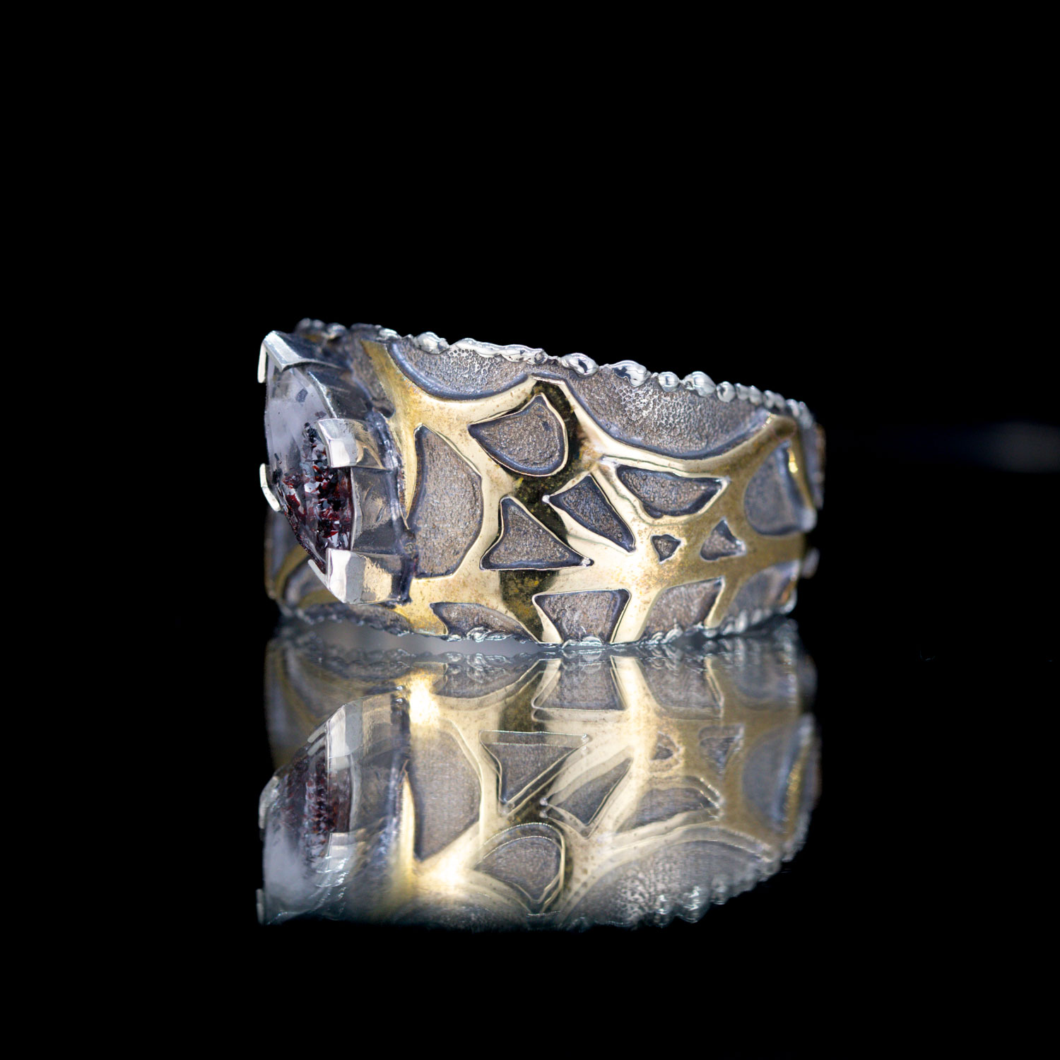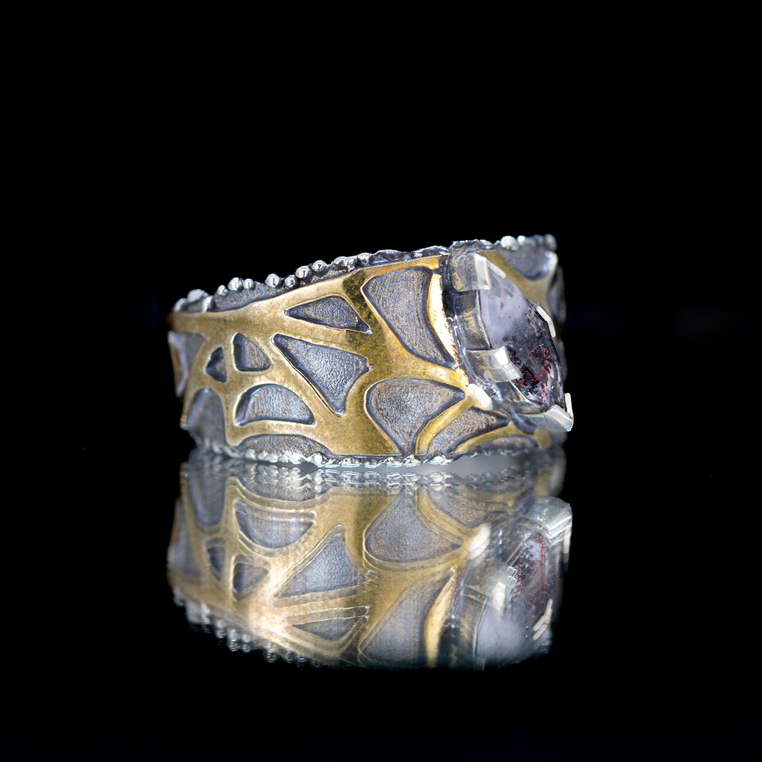 Disco Fire Quartz aka Lepidocroicite and sometimes called Super 7 when there is Amethyst present in the matrix. This ring features a beautiful marquis shaped tablet cut Disco Fire Quartz in a sterling silver setting. The ring has a sterling silver band that has been textured at the edges by tig welding and has a brass spiderweb motif overlay.