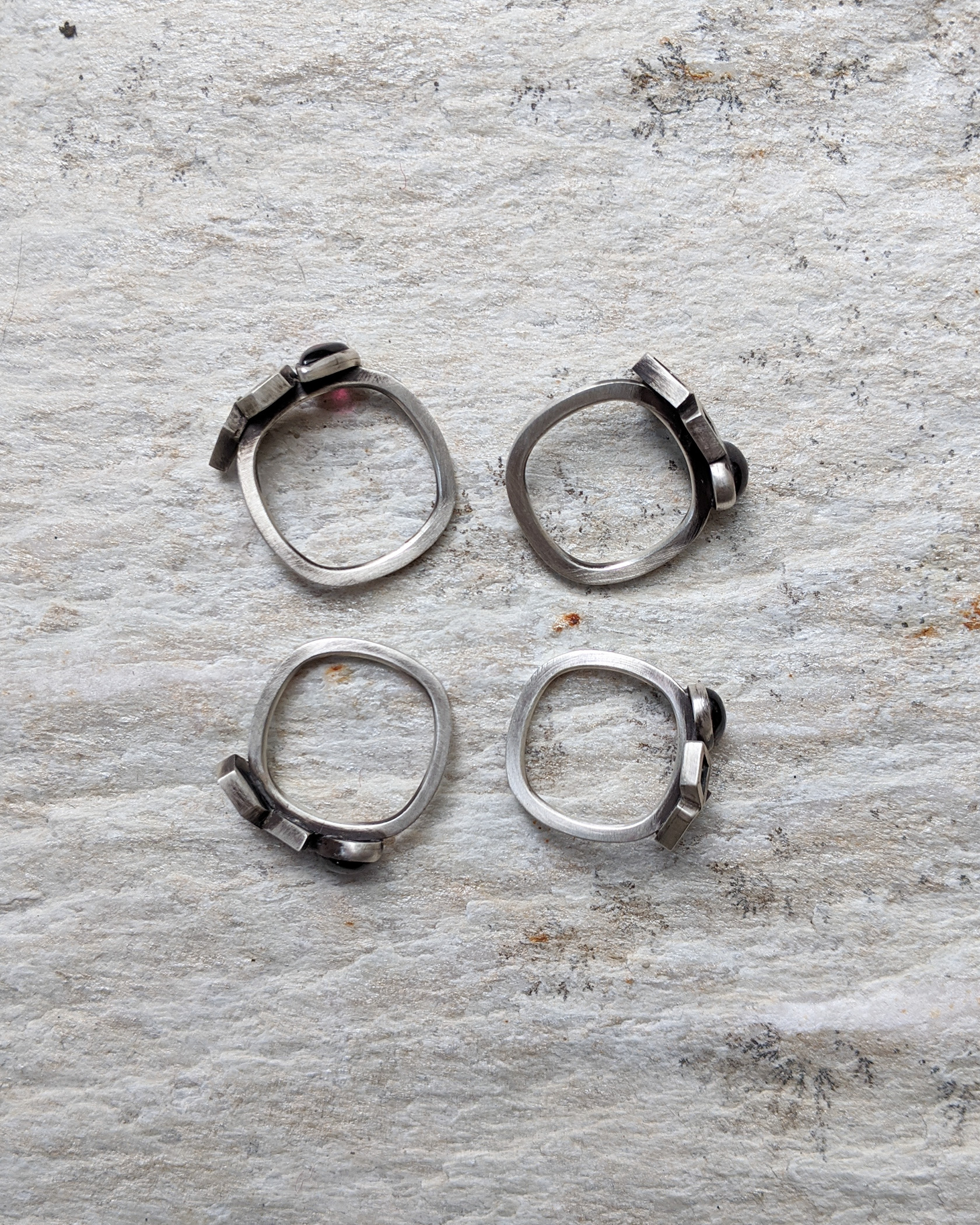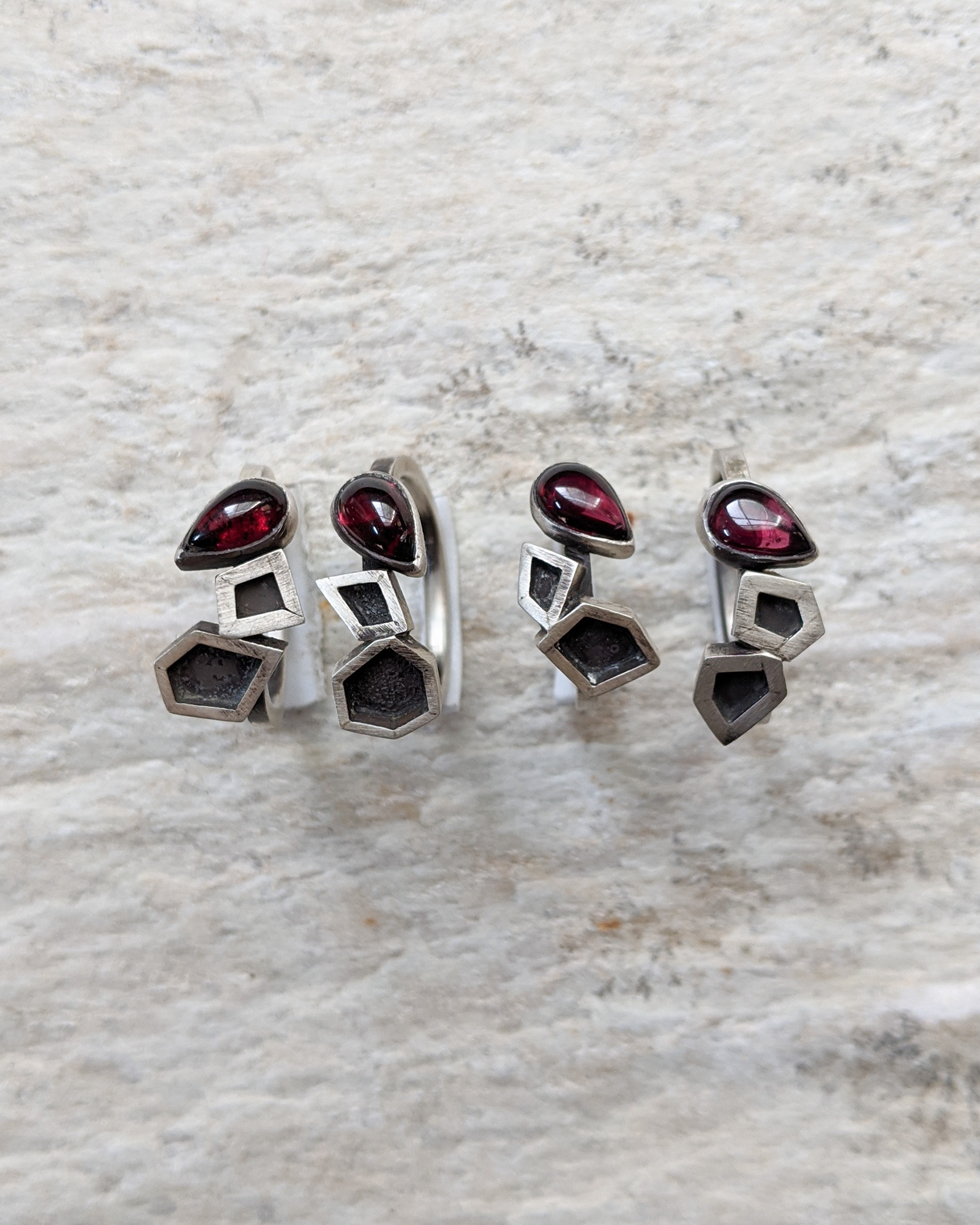 Sterling silver garnet geometry rings with hard angles and straight lines contrasted against the rounded edges of the stone and the ring band. Deep red and juicy pear shaped garnet cabochons pair with the dark voids in the angular shapes on this ring. The soft square shaped band is more forgiving on sizing, easier to fit over knuckles without being too loose.