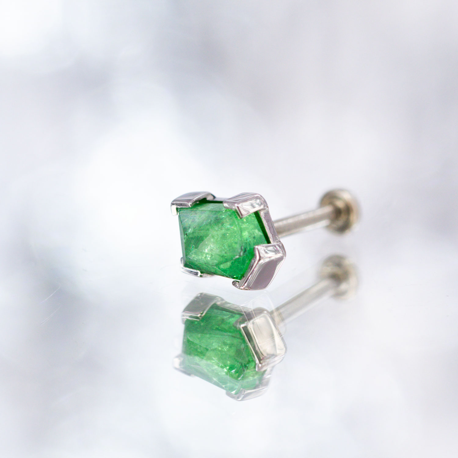 Unbelievably green color in striking shapes and sizes. The newest offering from us at Mettle and Silver are these stunning Tsavorite Threadless ends. Â Severe geometry and glossy high polish 14kt yellow gold for a very special showstopper