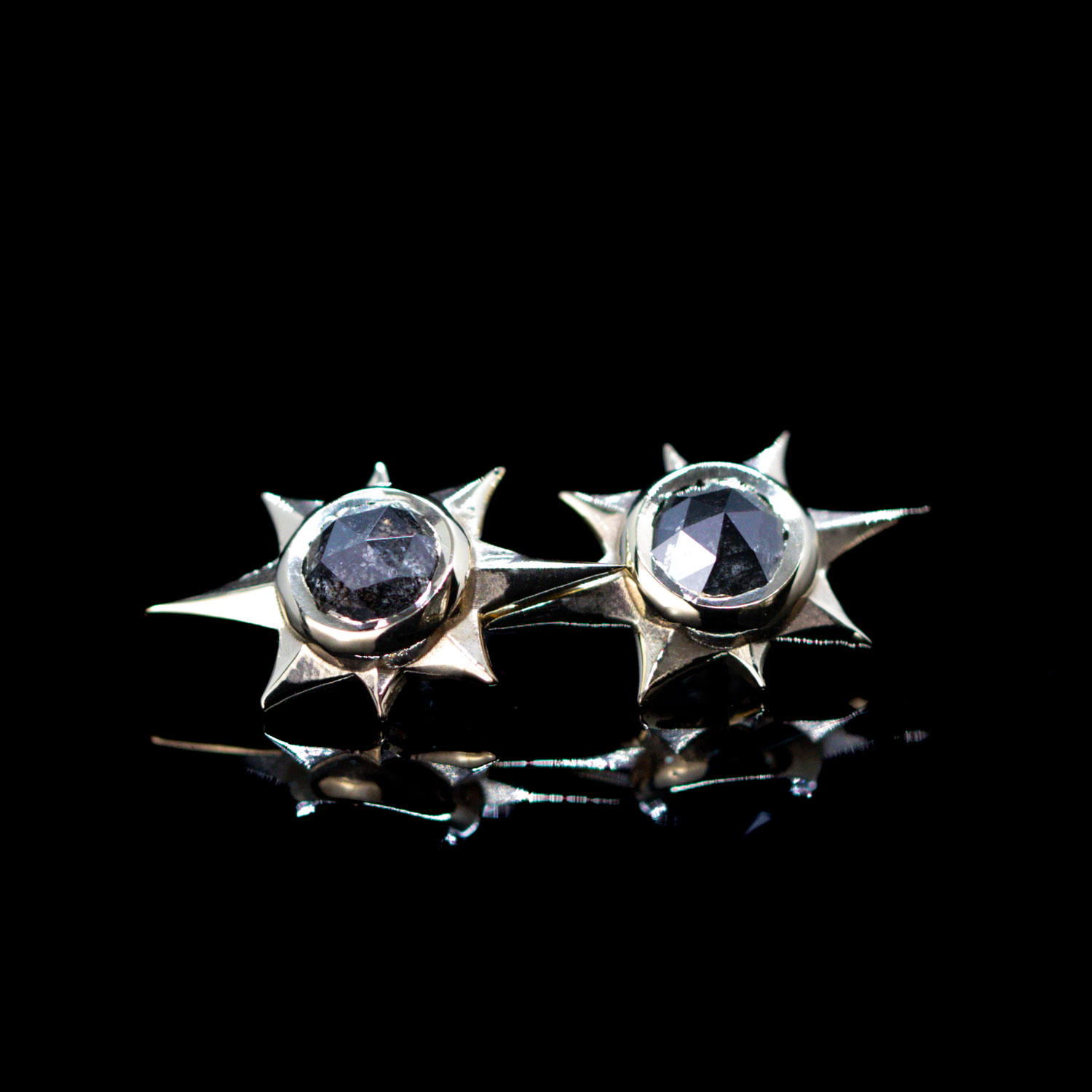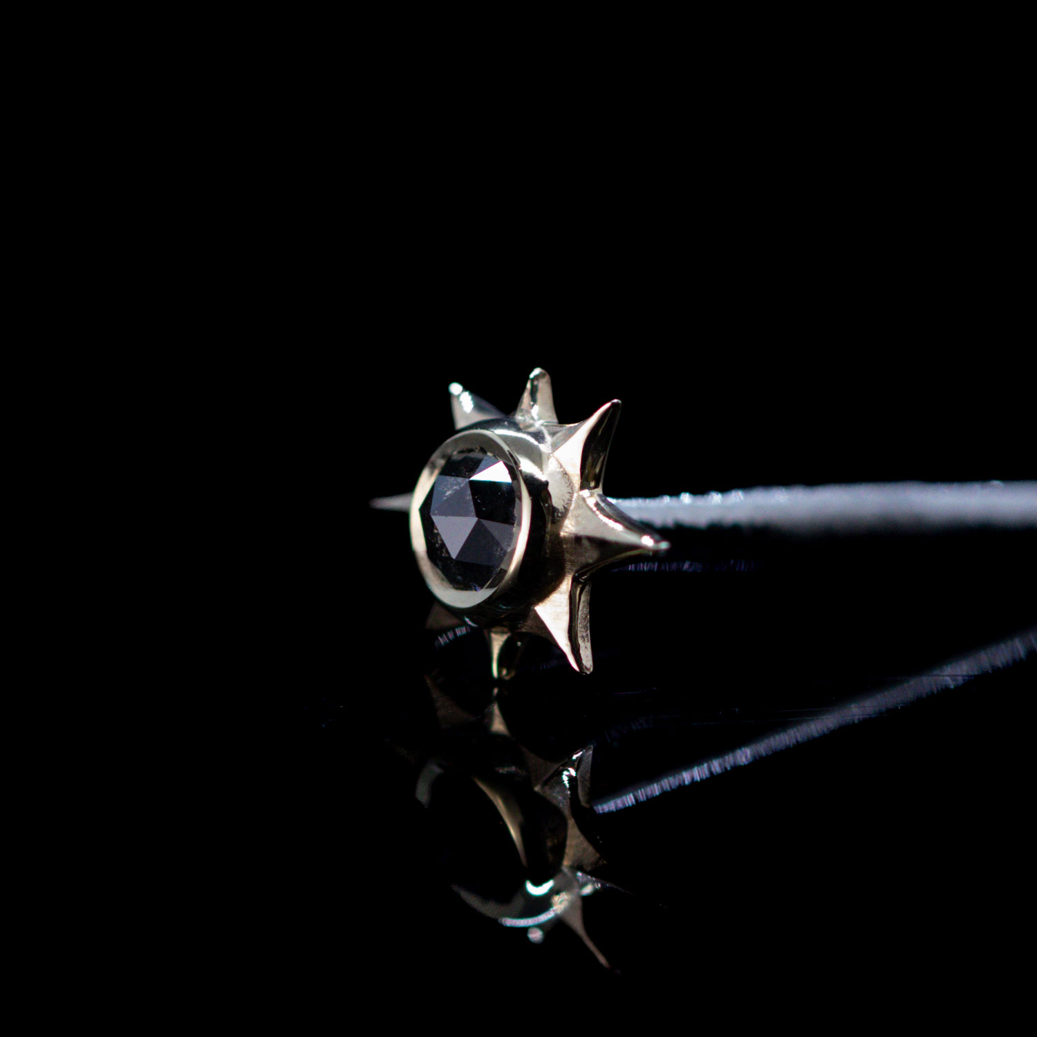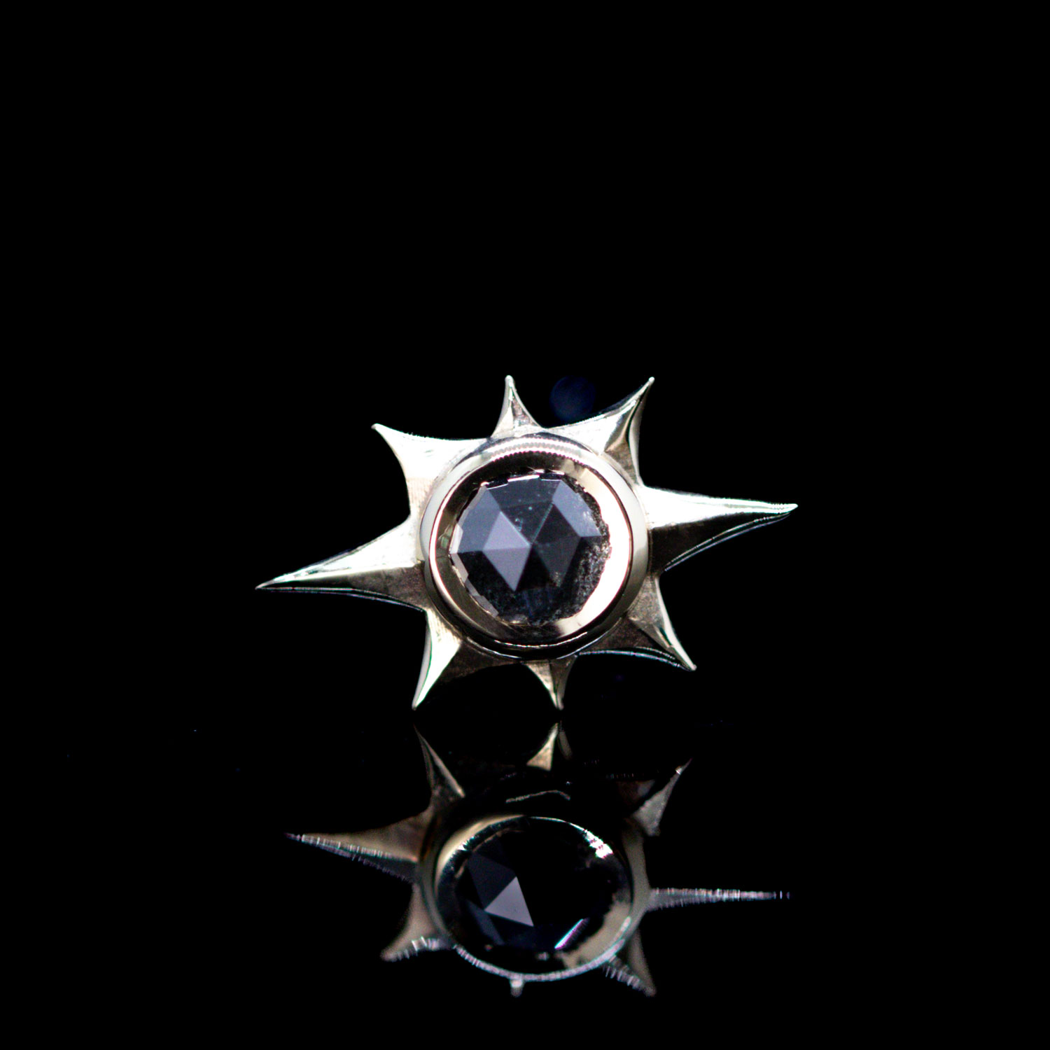 The Evelyn design is a large beveled starburst with bezel set gem in the center.