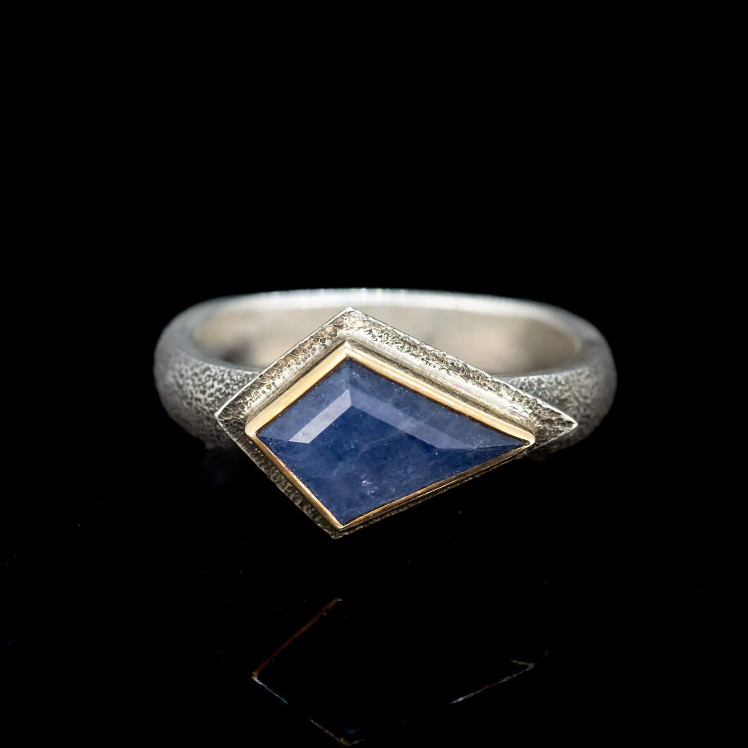 A stippled band in a soft square shape, textured bezel, and 14kt gold come together for this stunning setting of a large Umba Sapphire.