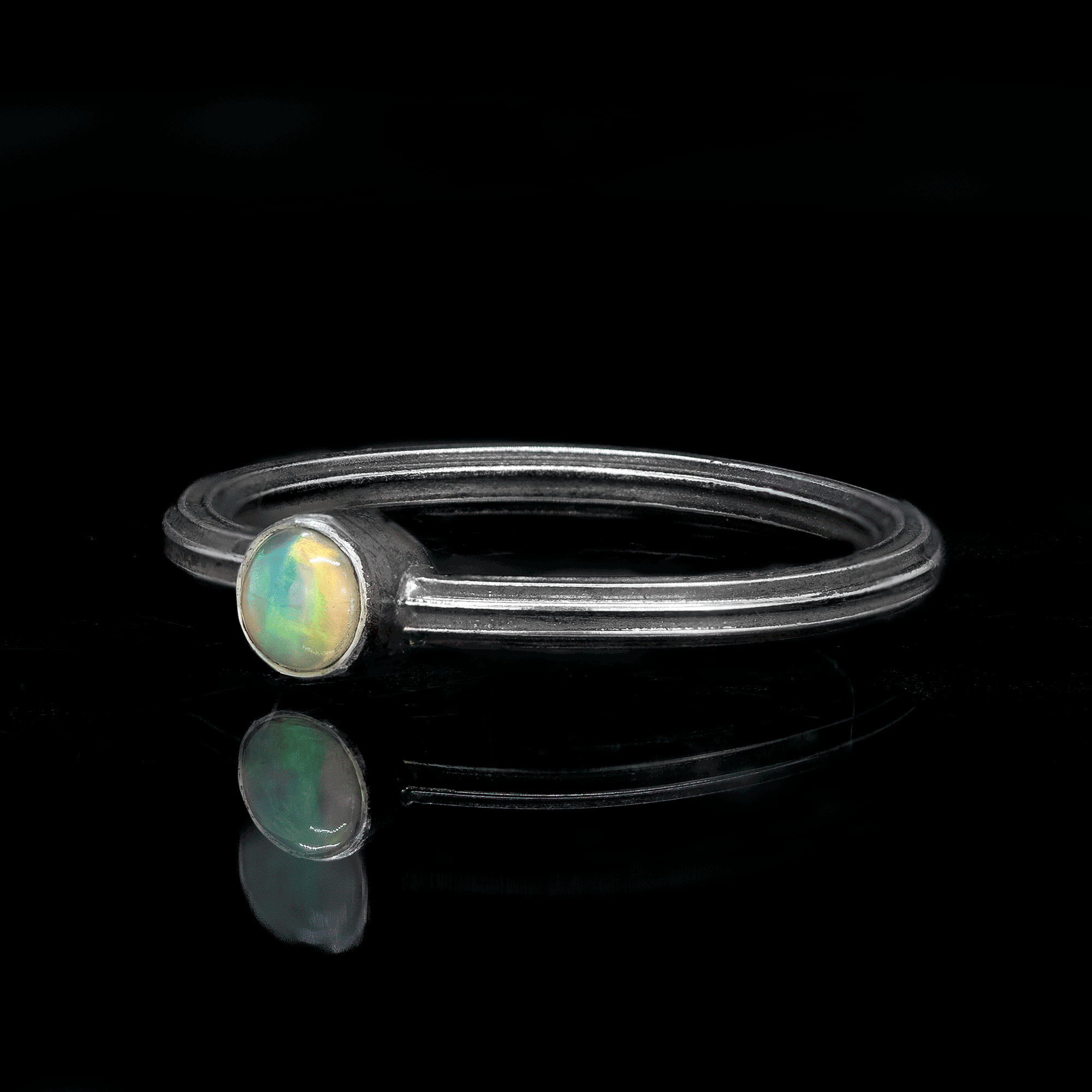 Little galaxies in tiny gems on dark bands. This ring features an Ethiopian Opal cabochon in oxidized and polished sterling silver. This dark material has been enhanced by selectively polishing high points of the fluted wire band. Available in multiple sizes in a very stackable shape.