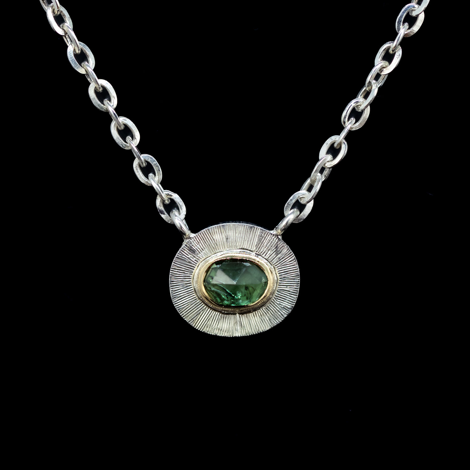 A match for the Madagascar sapphire Cuts rings. This pendant displays a rose cut sapphire with a blue green color in a yellow gold bezel. There is hand engraved bright cuts on the sterling silver face of the pendant to amplify the sparkle.