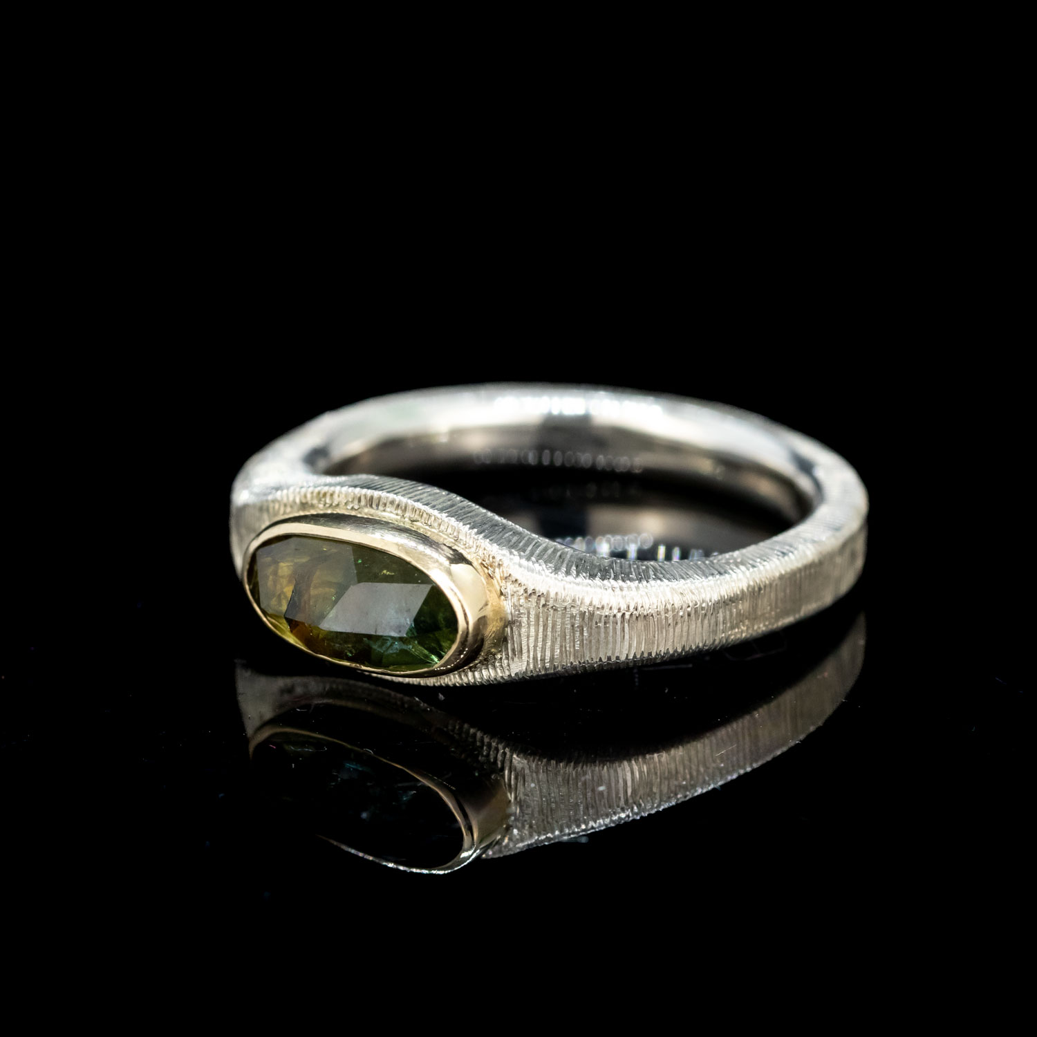 A beautifully fluted band, textured bezel, and 14kt gold come together for this stunning setting of an elongated oval Madagascar Sapphire. The slightly off kilter hexagon shape is playful while remaining elegant on the finger.
