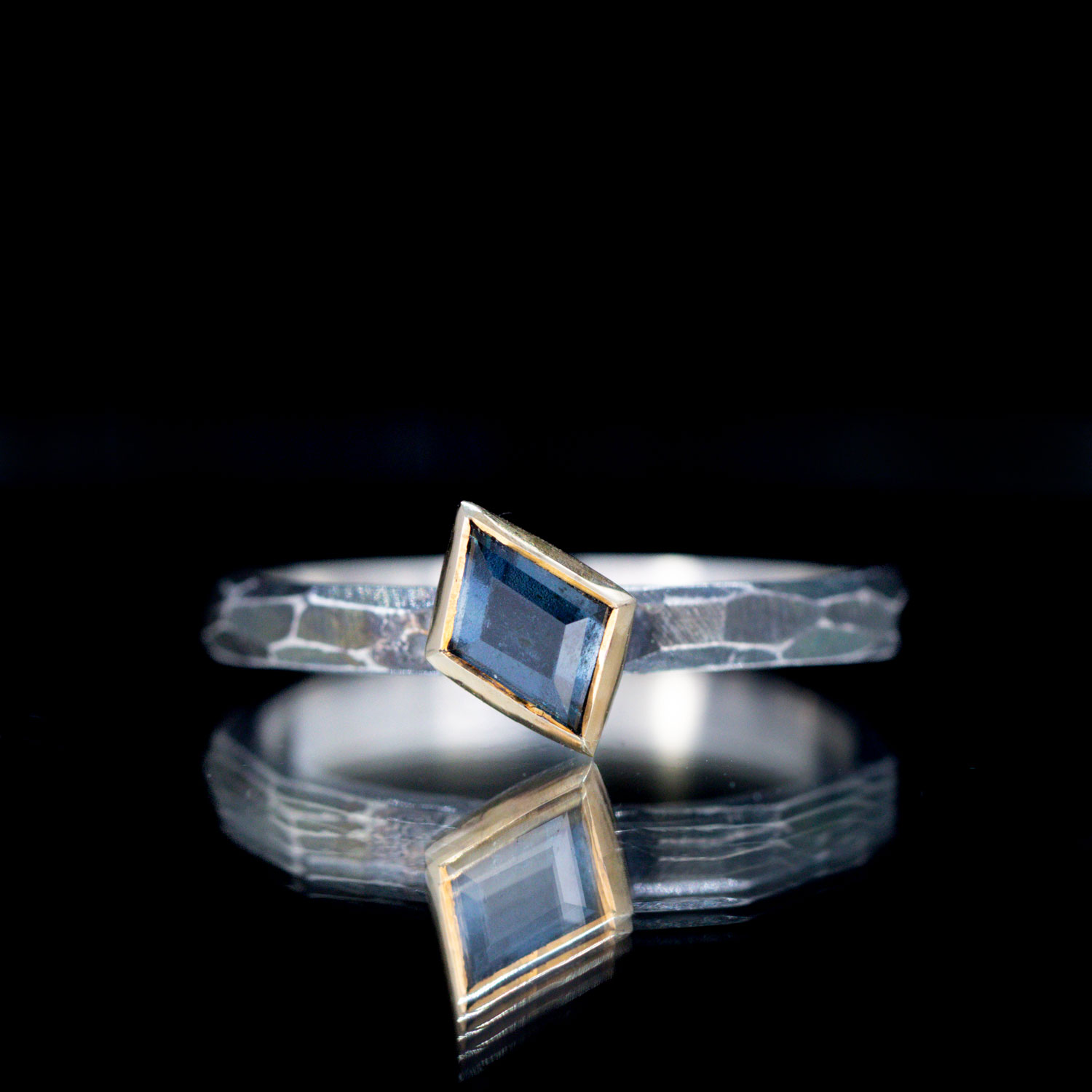 We love our stacking rings. This mixed metal ring features a sterling silver band with a 14kt yellow gold bezel. The sterling silver band has a dark patina with facets polished up to enhance the texture.