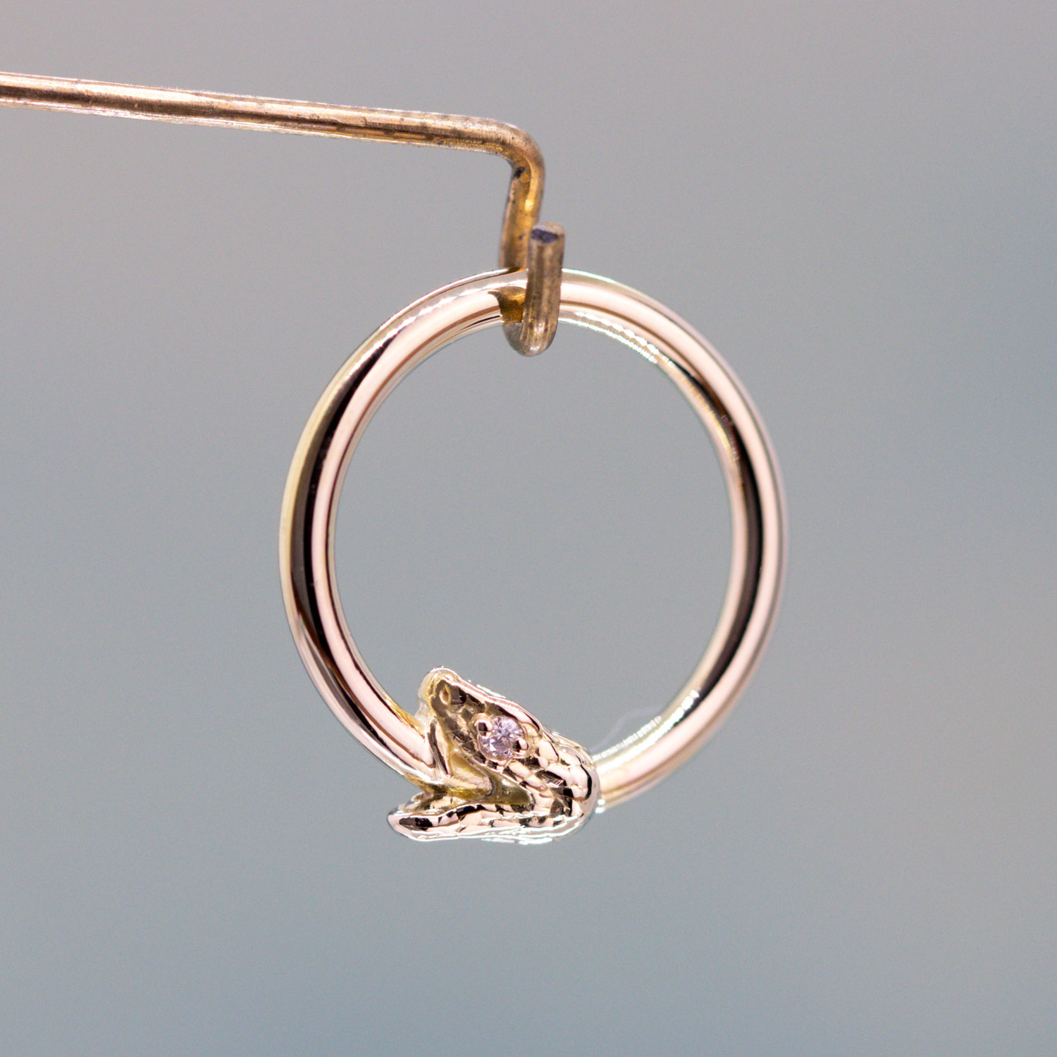The Snake seam ring is a versatile piece of jewelry that makes a fun twist on the traditional fixed bead ring used frequently in body piercings. Each size of snake head has been carefully designed with sizes medium and large featuring tiny diamond eyes.