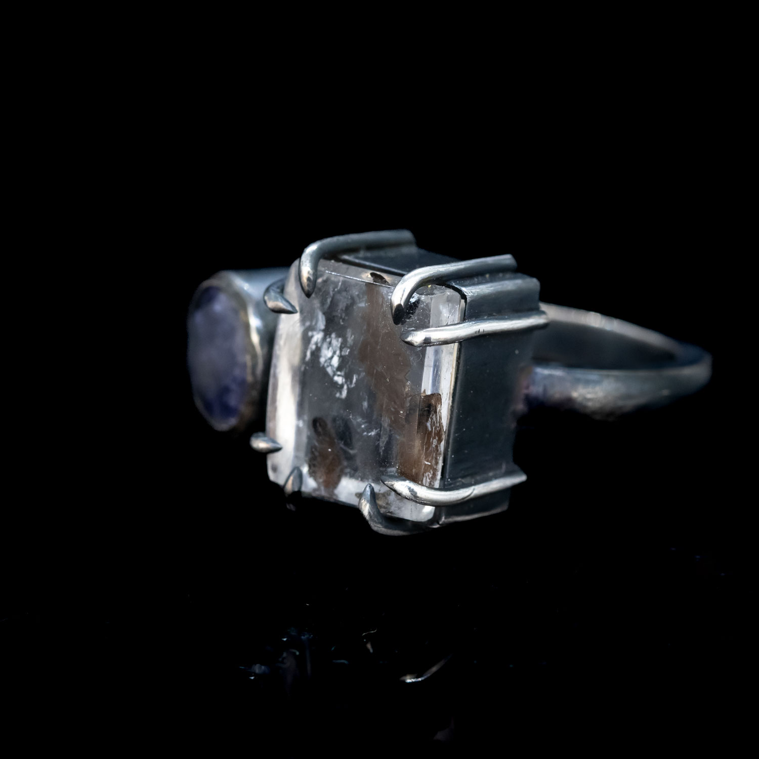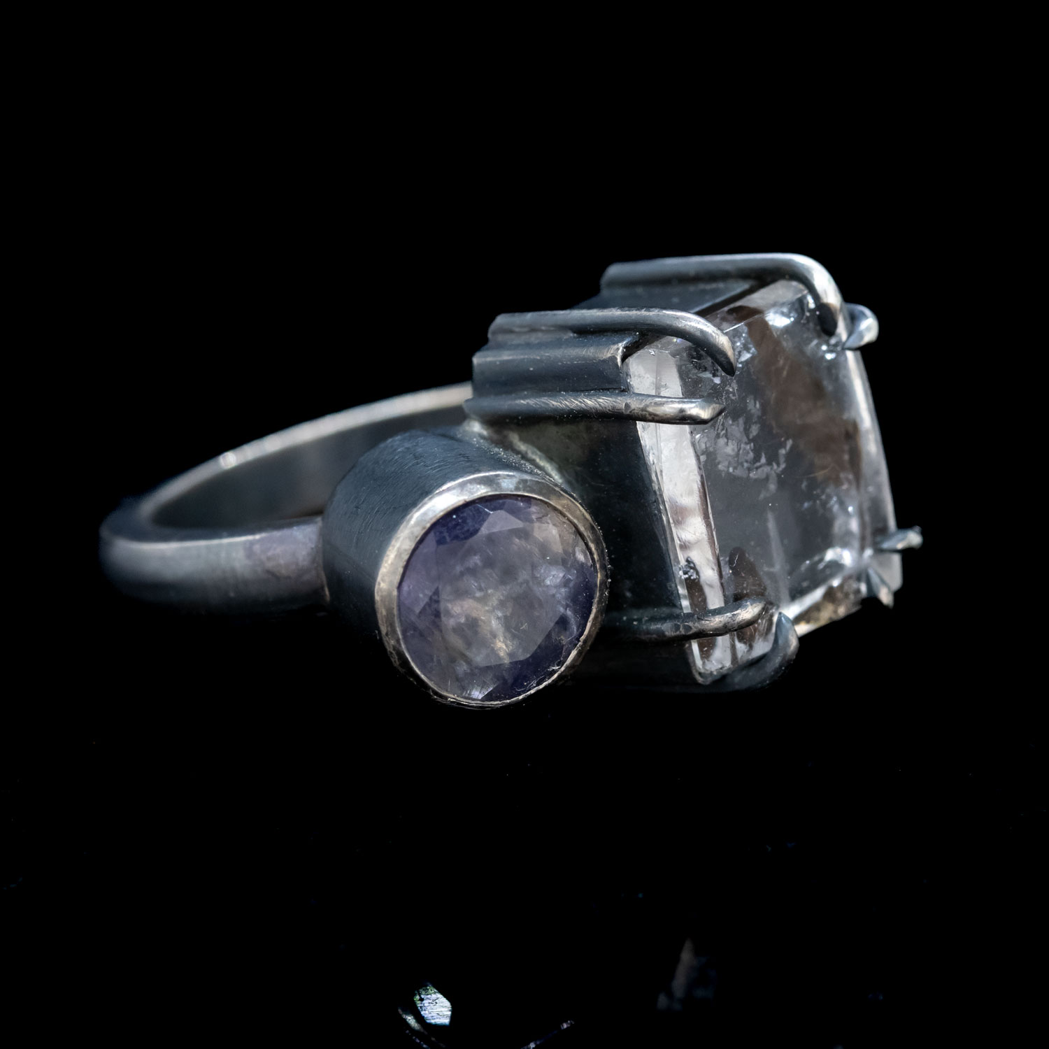A maganese included quartz crystal paired up to a muted violet iolite stone. This ring sits nice and tall on the hand and has a great deep patina finish to show off the two stones with a bit of it buffed back to showcase the prongs and bezel settings. As usual for us, this piece is entirely entirely hand fabricated in sterling silver!