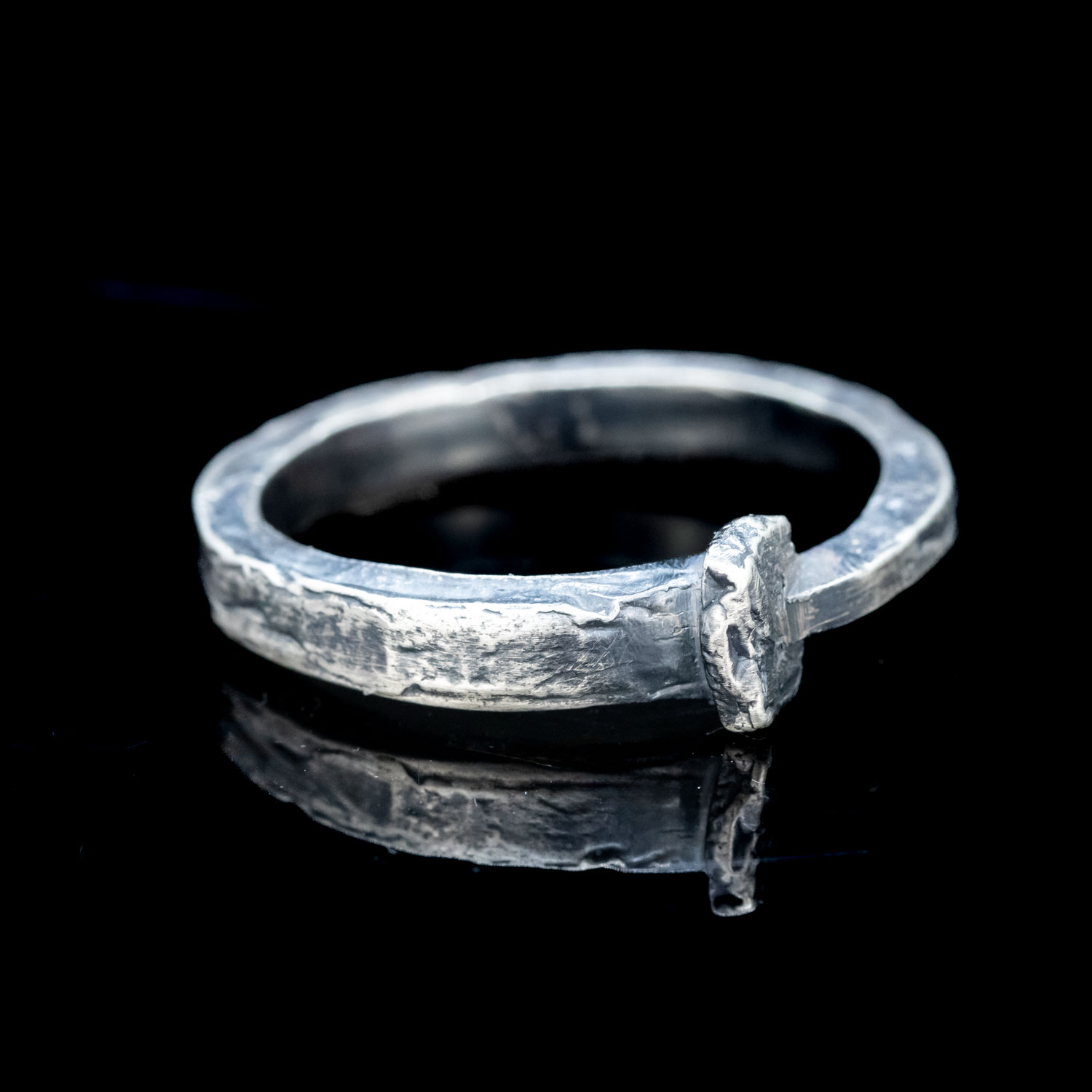 Inspired by our surroundings, the Salvage ring is modeled after an antique iron nail pulled from 150+ year old cherry lumber. This ring has been made in sterling silver with each ring displaying unique blemishes from its past and inspiration. To stay in touch with its antique beginnings, the ring has a darkened patina that has been selectively removed to highlight the bright silver that it is made from. Available in multiple sizes to fit every person.