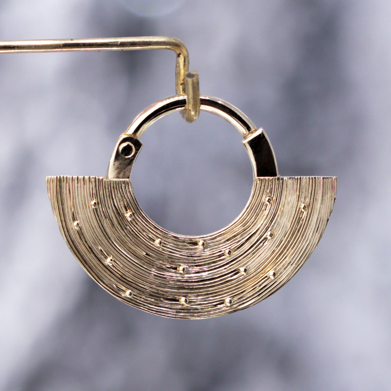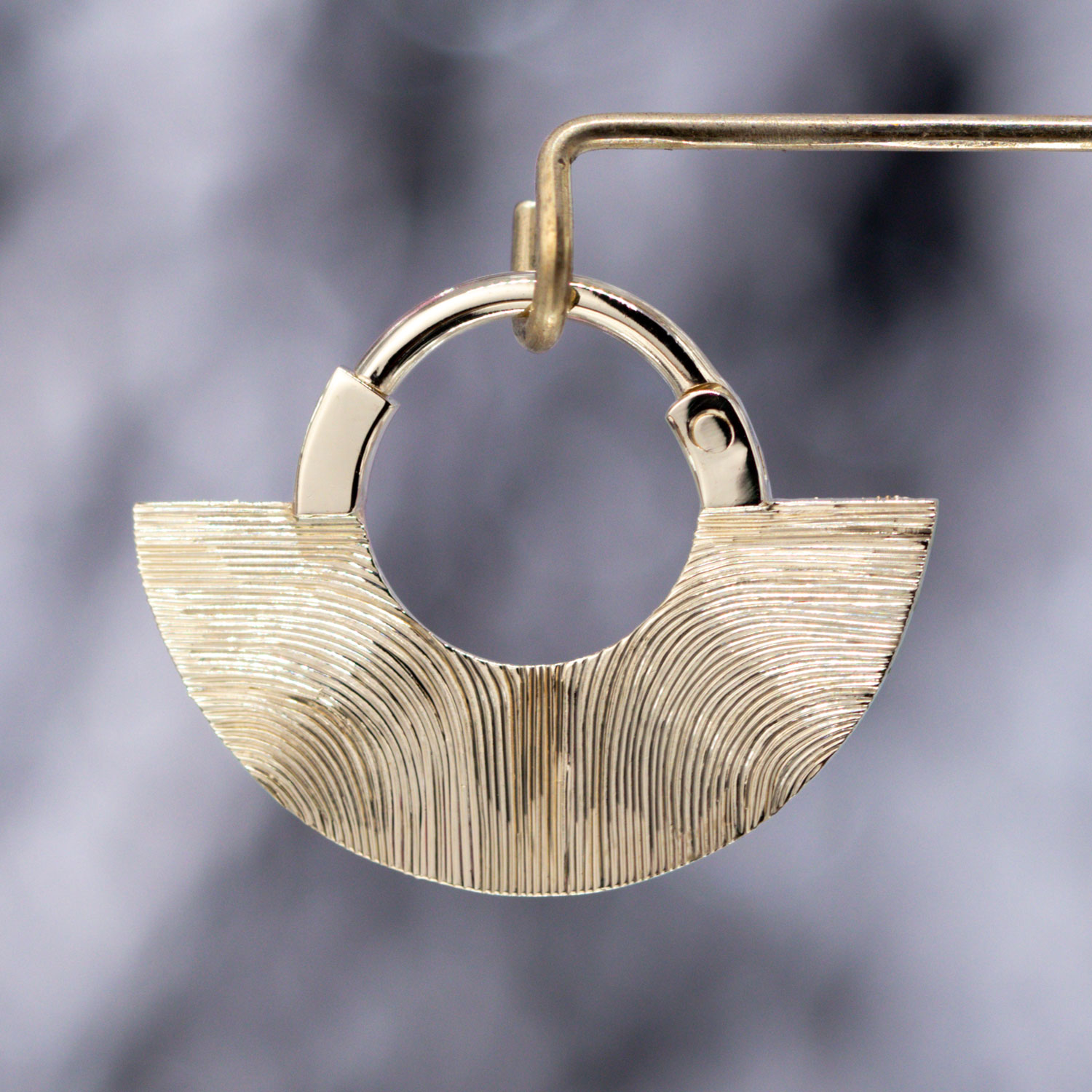 A completely unique offering from the Mettle and Silver workshop. Hand engraved on both sides for versatility, this hinge ring or clicker is beyond unique and wonderfully hand fabricated. This is the perfect new septum or daith jewelry with measurements of 18gauge and 8mm and a secure handmade hinge.