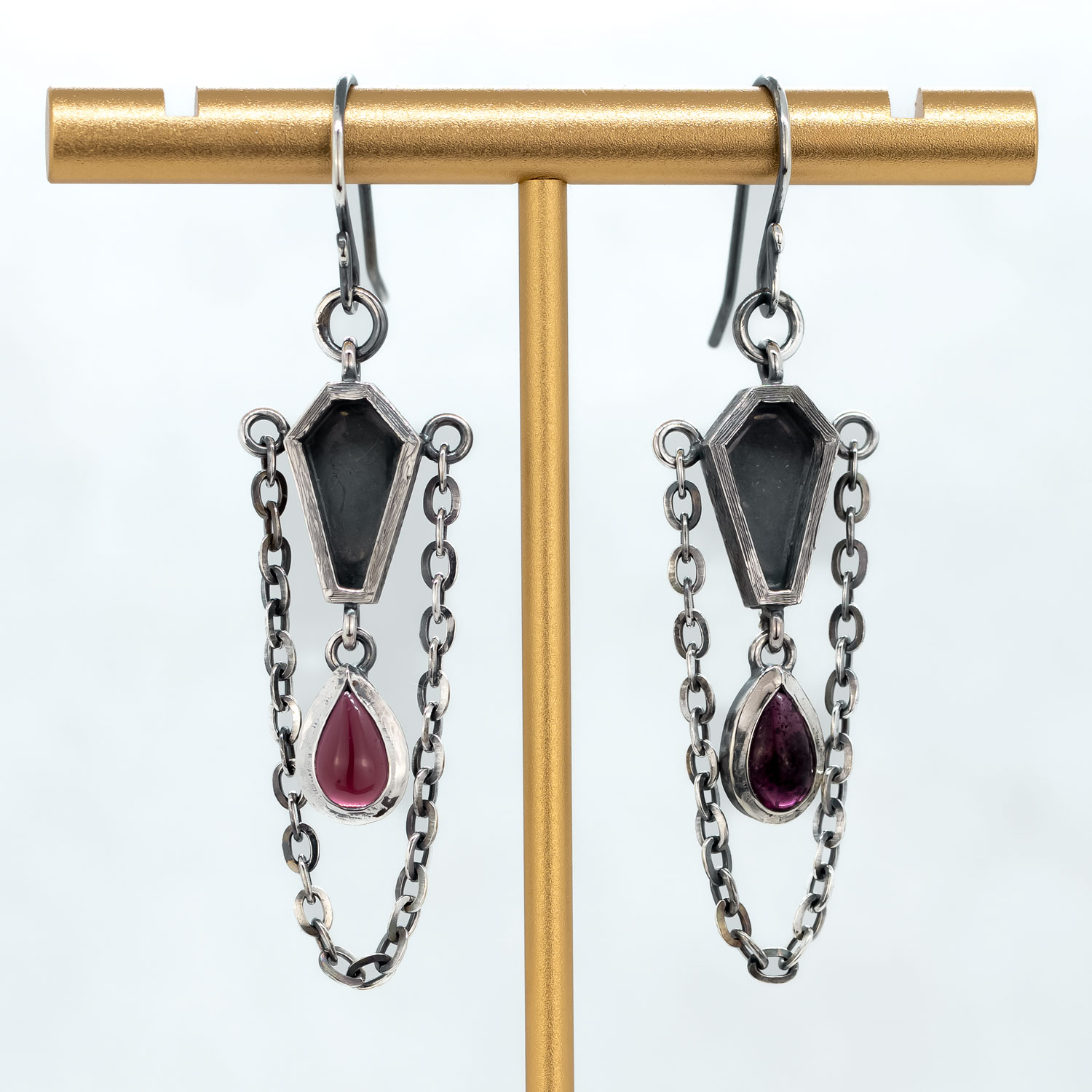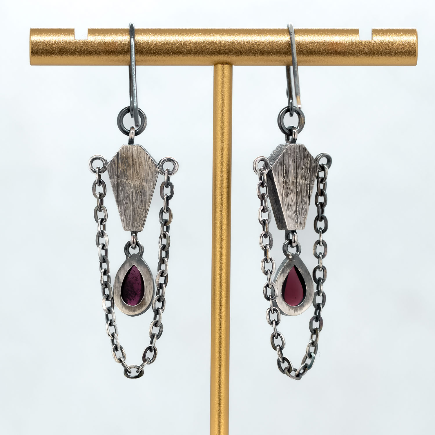 Very vampy coffin earrings handmade in our studio. These earrings incorporate sterling silver and garnets in a fun, wearable size. The coffins are textured to resemble wood grain and all of the sterling silver has been darkened and then polished back selectively to accentuate the textures and depth in the design